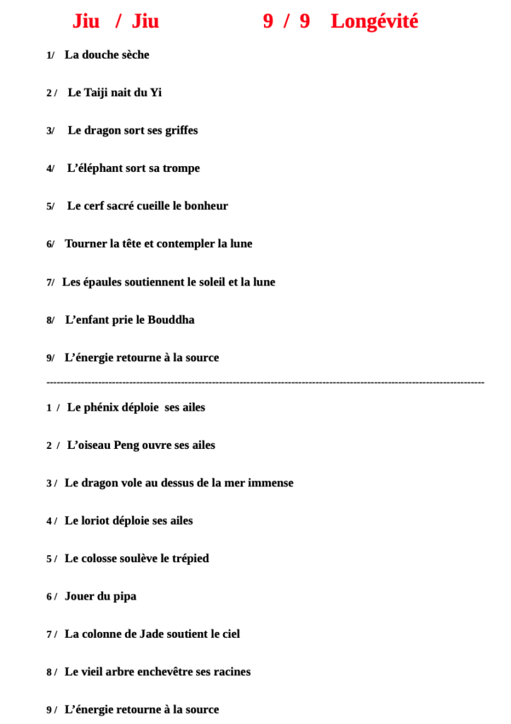 Ceux sont des mouvements puisés dans différentes suites, tels que la tonification générale 1 et 2, les brocarts, l’enchainement du coeur ou poumon…